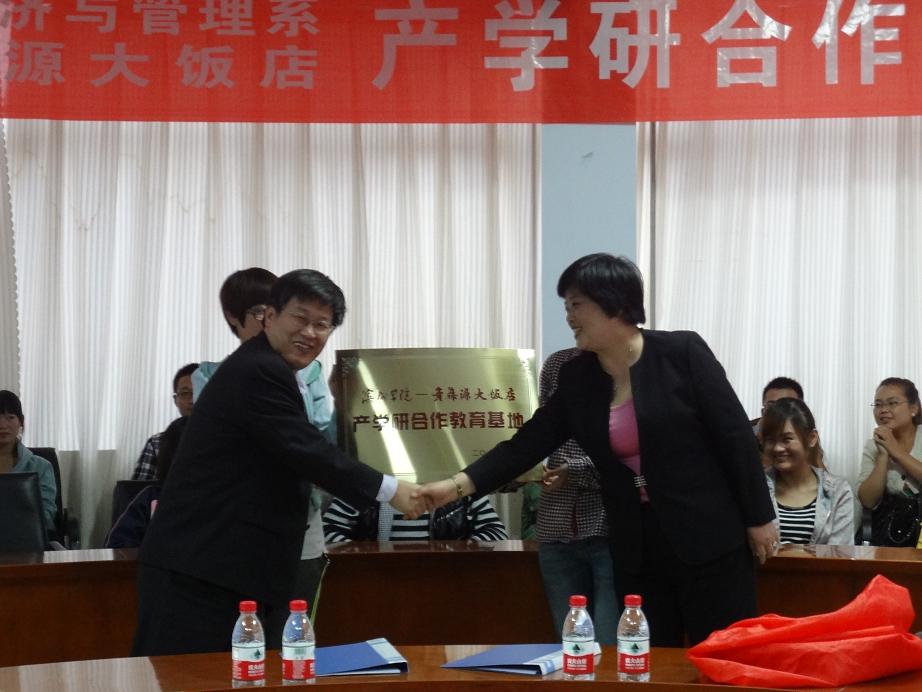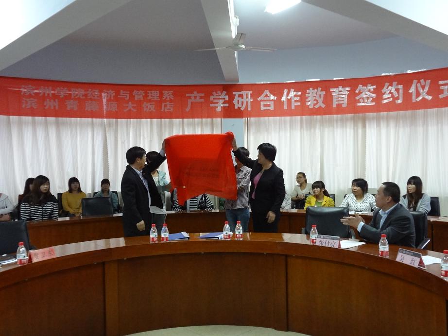 最后,双方在友好融洽的氛围中签署了滨州学院经济与管理系与滨州青藤源大饭店的产学研合作教育协议,系党总支贾卫东和吴红总经理为校企合作产学研合作教育基地揭牌。