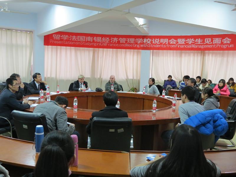 经济与管理系党总支书记贾卫东代表经管系3100余名师生对法国朋友的到来表示欢迎,南锡学校的副校长向经管系师生介绍了学校的概况。随后我系联合办学学生就一些感兴趣的问题与法方代表进行了交流。