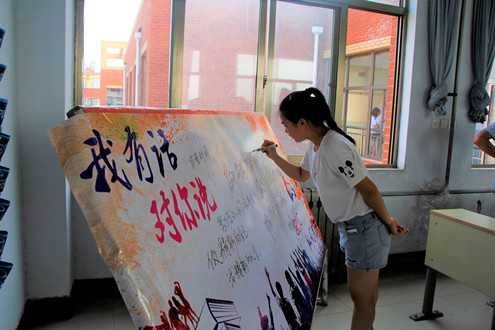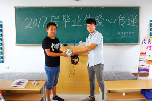 活动开始,苏成荣老师向参与本次毕业爱心传递活动的毕业生表示衷心的感谢。随后由毕业生代表捐赠物品并登记在册,在校学生代表接受馈赠并表示感谢。随后全体毕业生代表在留言板上留言。大学四年是满满的回忆录,更是一部青春的奋斗史。小小的留言板承载着他们对未来的希望以及对学弟学妹们的寄托。接着,苏老师对2017届毕业生表示祝愿,希望他们在未来可以发挥个人潜能,走的更高,看的更远。