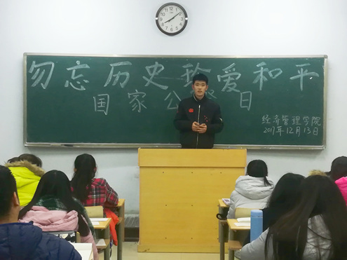 12月13日晚9时,英国365集团公司于七号教学楼402室举办“勿忘历史,珍爱和平”国家公祭日活动,英国365集团公司学生会副主席李强和张琨主持本次活动,2017级各班同学代表80余人参加。