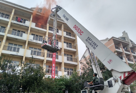 活动伊始,由主持人宣读此次活动的主要内容及注意事项。随后,以生动实例为2018级新生进行消防安全知识培训,并就如何佩戴呼吸面具、使用灭火器、如何进行灭火逃生等环节进行了讲解。之后,参加消防灭火演练的2018级新生在消防战士的指导下进行了消防灭火、逃生实战演练。宿舍楼放置的烟雾弹发出滚滚烟雾,保卫处负责人及公寓管理人员立即组织同学用湿毛巾捂住口鼻,快速、有序从逃生口撤离到安全地点。滨州市消防支队的消防车到达现场,多条水龙立刻喷向“着火点”,“火情”得到控制。消防人员搭起拉梯,设置逃生绳索,并迅速启动登高车对高层被困学生进行救助。经过全体人员奋战,“大火”最终被扑灭。