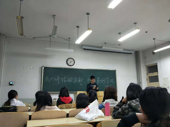 会上,班主任老师带领班级学生集体学习《本科审核评估知识手册》,向本班学生传达学校本科教学审核评估要求,讲解评估知识,阐明工作原则,严明校规校纪,引导学生全面了解本科审核评估的内容、意义和参与的主要途径。之后,班主任老师结合上学年综合测评和评奖评优数据,深刻分析检查班级学风中存在的短板,特别是一些严重影响班级学风的歪风陋习和慵、懒、散现象,努力引导学生营造 “人人勤奋学习,班班创优良学风”的良好氛围。随后,学生轮流上台发言,每人紧紧围绕“我为评估做贡献,树立良好学风”这一主题,从自身出发,结合实际生活,阐述了自己对学风的理解及可以为学风建设所做的力所能及的事情。同学们纷纷表示要主动用心地投入到学风建设活动之中,为学校的审核评估贡献自己的力量。
