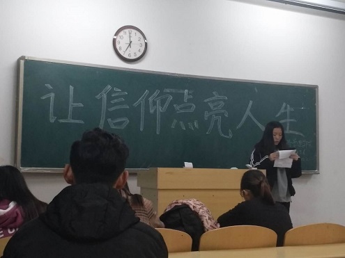 本次班会以“让信仰点亮人生”为题。班主任首先就社会主义核心价值观的丰富内涵作了详细介绍,充分解说了培育和践行社会主义核心价值观的重要意义。随后,同学们主要围绕社会主义核心价值观体系,开展了演讲、讨论交流等多种形式的活动,展现了良好的精神风貌,许多人都分享了自己对社会主义核心价值观的理解,表达了坚守社会主义核心价值观的信念。同学们纷纷表示,在日常生活中自觉接受、践行社会主义核心价值观,使社会主义核心价值观成为自己的基本遵循,形成自觉奉行的信念理念,争做文明守纪好学生,用实际行动来体现社会主义核心价值观。