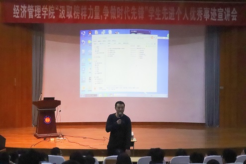 宣讲会上,十佳学习标兵吴挽挽同学以“仰望天空,脚踏实地”为题,向学弟学妹们着重分享了自己参与“三创”赛的一些实用干货,从起初的参赛作品设计,到寻求机会、过关斩将,最终获得国家级奖项证明自己的奋斗历程;十佳大学生张倩同学以“精益求精,砥砺前行”为题,从学习、工作、生活三方面,分享自己入学以来的收获和体会,她以高效的学习方法、坚持不懈的勇气与不断探索的求知信念让自己从平庸走向优秀;获十佳大学生提名奖的李楠欣同学,向大家分享了自己学习和学科竞赛道路上的思想历程、成长经验,并希望同学们坚定理想信念,做好成长发展规划;获十佳学生干部标兵提名奖的张甜甜同学,从自身经历出发与同学们分享了自己大学的学习、工作经验,告诫同学们要珍惜大学时光,努力求知问学,从知识养成、实践能力等各方面提升自己,完善自己。最后,张智涛老师结合自身经历,鼓励同学们向榜样学习,激励同学们脚踏实地地追求梦想,不断进步,勇往直前。