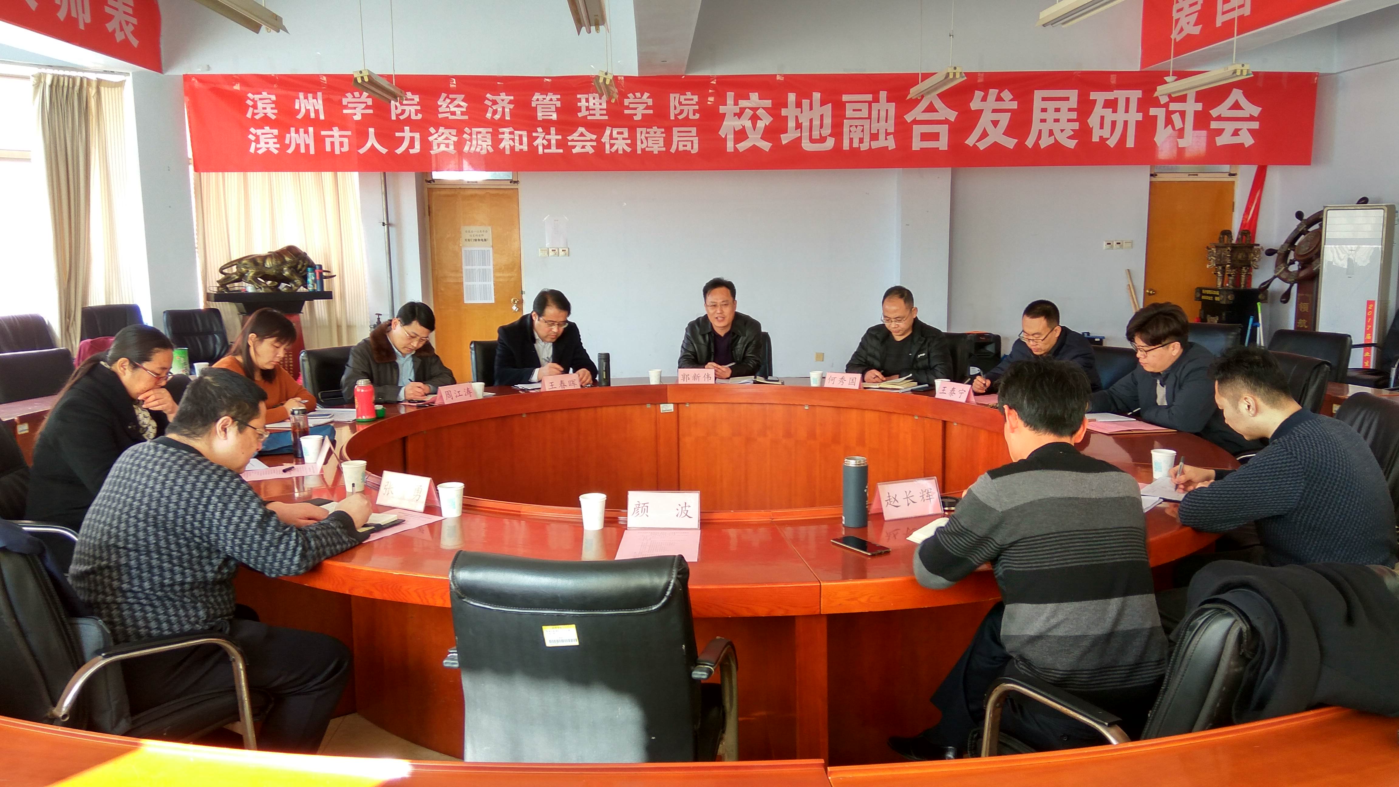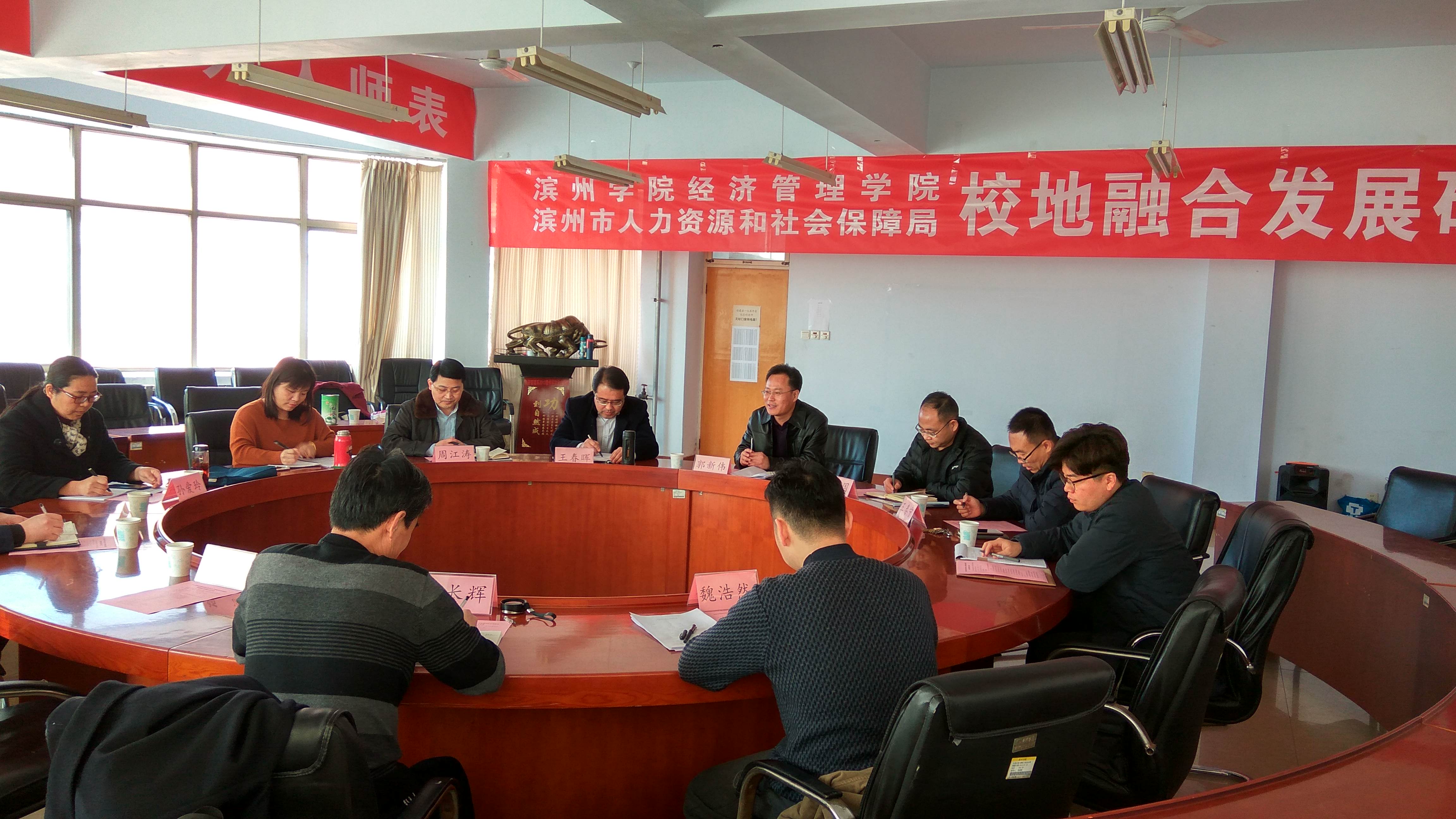 为深入全面推动校地融合发展,服务地方经济社会高质量发展,助力“富强滨州”建设,3月13日,我院与滨州市人力资源和社会保障局联合召开校地融合发展研讨会。滨州市人力资源和社会保障局党组成员、副局长颜波,滨州市劳动就业办公室主任张勇一行5人参会,院长郭新伟、副院长王春晖、副书记何秀国出席,校团委挂职副书记、我院就业科科长王泰宁及部分骨干教师参加研讨,副院长周江涛主持。