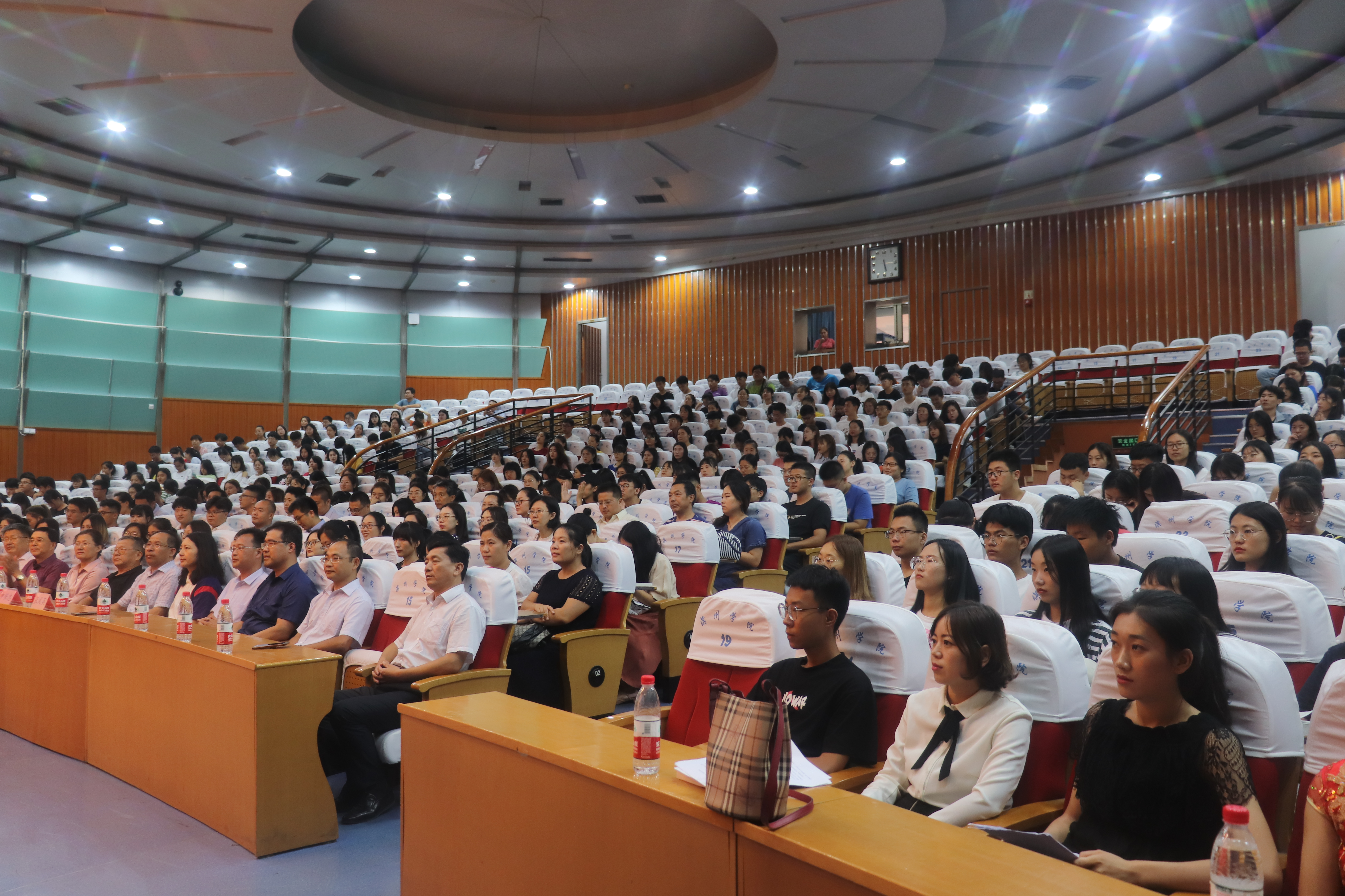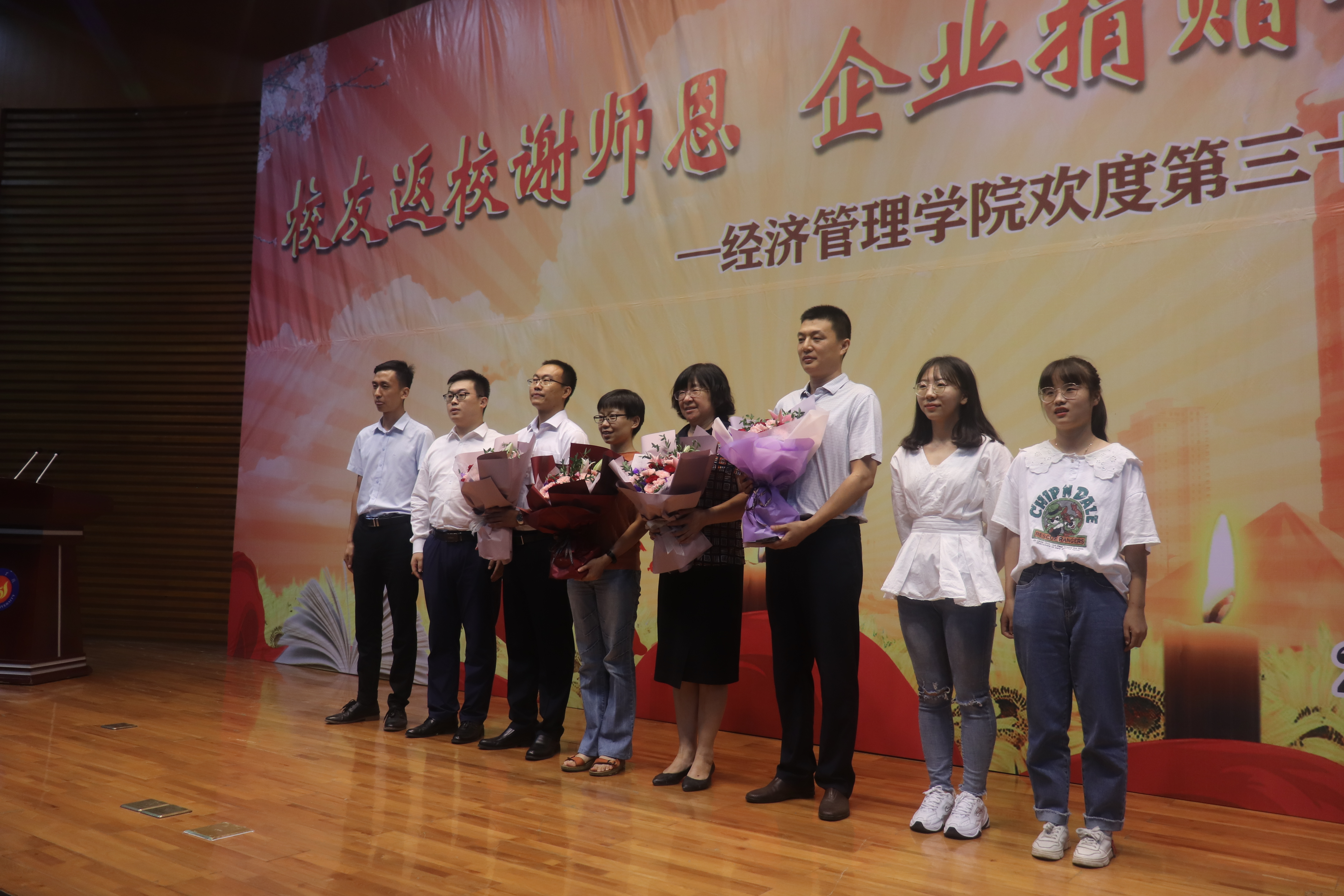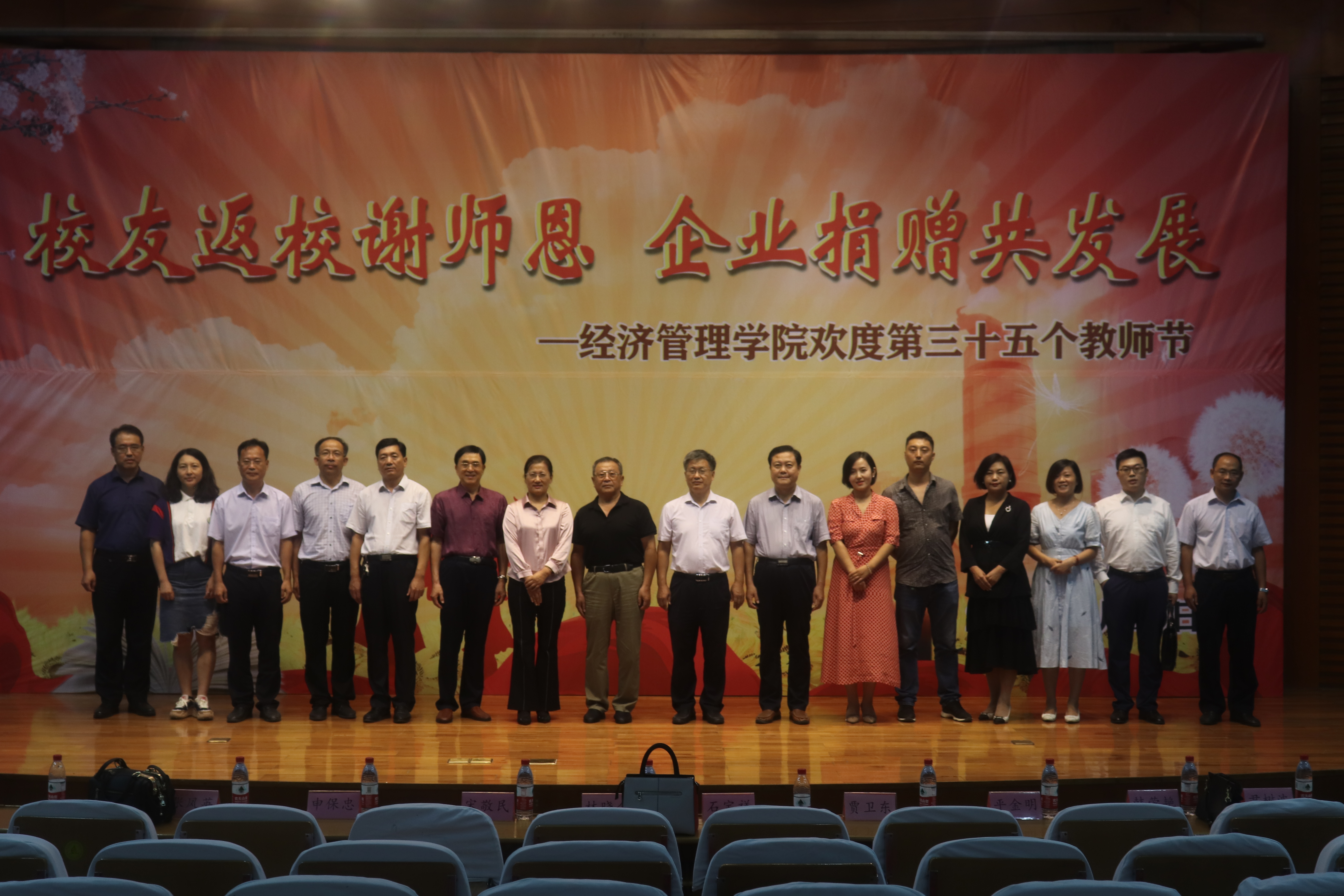 最后,全场起立合唱《我和我的祖国》,献礼祖国70华诞。经济管理学院第三十五个教师节活动在歌声中圆满结束。活动结束后,与会领导、嘉宾、校友在学苑会堂合影留念。