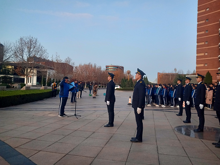 早上6:30分,待全体参与人员就位,一切准备就绪之后,主持人宣布升旗仪式正式开始。国旗班的旗手们着装整齐,迈着矫健而整齐的步伐,护送着鲜艳的五星红旗入场。伴随着《义勇军进行曲》,五星红旗冉冉升起,迎风飘扬。在场的每一个人向国旗行注目礼,深怀对祖国无限的热爱和崇高的敬意。随后,学生代表王京廷同学进行“我与祖国共奋进”国旗下的演讲,作为青年大学生要牢记初心,勇于担当,敢于有梦、勇于追梦、勤于圆梦,释放青春能量,点燃青春梦想,在为实现中华民族伟大复兴的奋斗中实现人生价值!最后,主持人带领全体学生在国旗下重温入团誓词,庄严宣誓。