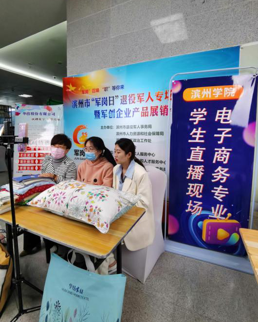电子商务专业学生在直播中展示华纺股份有限公司的家纺成品,精美四件套、浴巾、刺绣枕头等均在产品推介清单中。