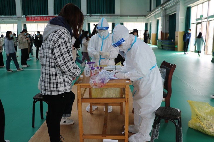 下午3时,英国365集团公司学生科长张智涛、辅导员老师及学生志愿者来到我院核酸检测场地查看场地布置,确保检测工作安全、有序、高效开展。此前,英国365集团公司各工作人员早已到达现场,做好了各项准备工作。在新体育馆设置了数个核酸采样台,等候区、入口处、录入区、采样区等标识明确,多名师生志愿者在场内导引、维持秩序。医护人员身着全套防护服,穿戴好口罩、面屏、手套等装备,熟练、快速地投入到每一次采样工作中。