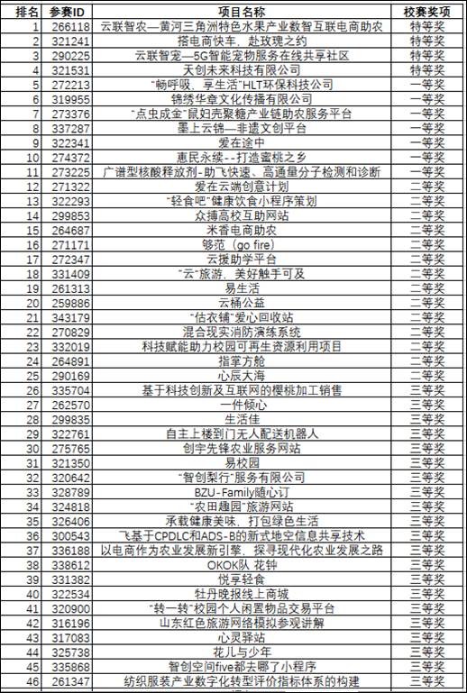 第十二届全国大学生电子商务“创新、创意及创业”挑战赛校内选拔赛,共计71个团队报名参赛,因疫情采用网上评审方式,经专家评审委员会评审,大赛最终确定46项获奖项目,现公示3天,获奖名单公示如下: