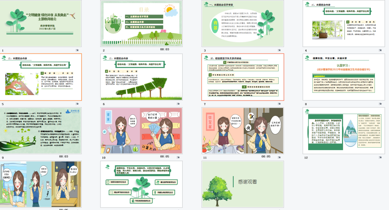 班会后,同学们也纷纷表示,自己会积极行动起来,从个人做起,从点滴做起,主动自觉参与“绿色出行”“垃圾分类”“光盘行动”“健康乐跑”“宿舍公约大赛”“预防传染病健康知识竞赛”等实践活动,把文明健康、绿色环保的生活方式融入到日常行动中,努力为建设健康校园、平安公寓贡献出自己的一份力量。