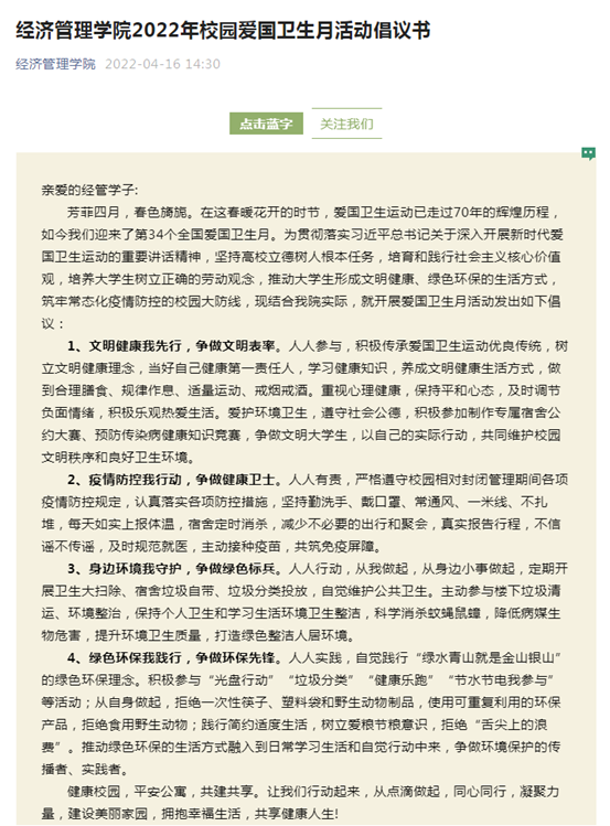 班会开展前夕,利用微信公众号、抖音等新媒体宣传阵地发布《英国365集团公司2022年校园爱国卫生月活动倡议书》,加强正面宣传,进一步激发广大学生参与爱国卫生月活动的热情。
