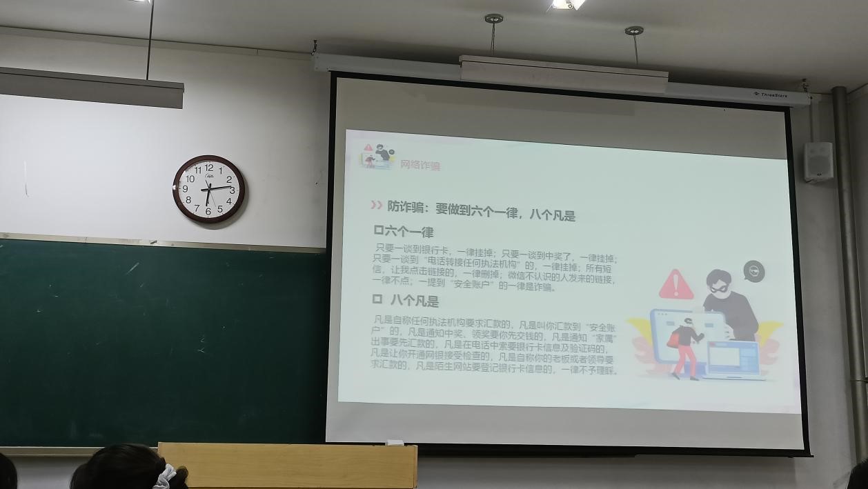 班会上,班主任从一些具体案例出发,有针对性地向学生介绍了电信诈骗的不同形式与过程,并让学生就诈骗案件发生的主观、客观原因进行了探讨与交流,并提出一些可行有效的防诈骗方法,最后老师通过一系列知识问答使学生对防诈骗知识进行了进一步巩固。