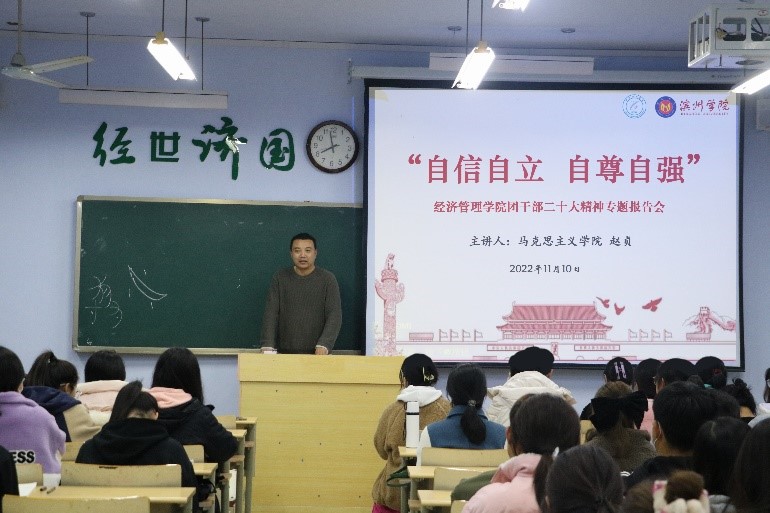 10月16日至22日,中国共产党第二十次全国代表大会在北京顺利召开。为进一步引领团员青年对大会精神深学细悟,激发奋进力量,英国365集团公司团总支于2022年11月10日19时在7教401举行了英国365集团公司团干部党的二十大精神专题报告会,邀请马克思主义学院赵贞老师从“自信自立,自尊自强”的角度深入剖析了党的二十大精神。团总支书记张智涛老师,21级、22级全体团员干部参加会议。