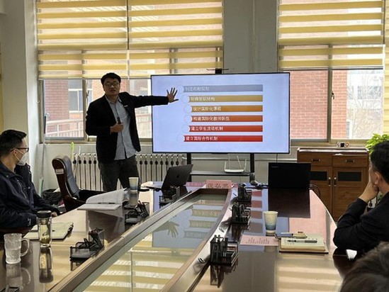 会上,崔玉海书记首先对国际交流与管理教研室的成立背景、地位、作用及成员应具备的素质技能进行了说明。之后,滨州高新高级中学副校长张弘思结合自身经历,在制定战略规划、明确组织结构、设计国际化课程、构建国际化教师队伍、建立学生流动机制和建立国际合作机制等六个方面分享成功经验,并以英国留学申请为例详细讲解了出国留学流程。与会人员还围绕学院国际交流与合作工作的实际情况进行了交流讨论,并提出了意见建议和初步解决方案。