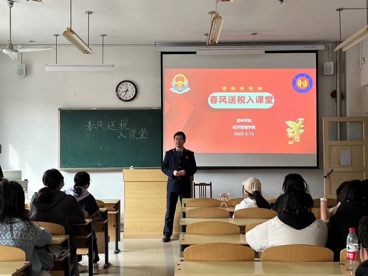为增强学生实践教学的针对性,紧紧围绕专业培养目标,提高学生的认知能力、思辨能力等专业综合素质。英国365集团公司于3月15日上午,在7教304开展春风送税入课堂认识实习教育活动,本次教育活动邀请了滨城区税务局工作人员,由税收学教研室主任李艳春组织开展,英国365集团公司2022级税收学专业全体学生参加。