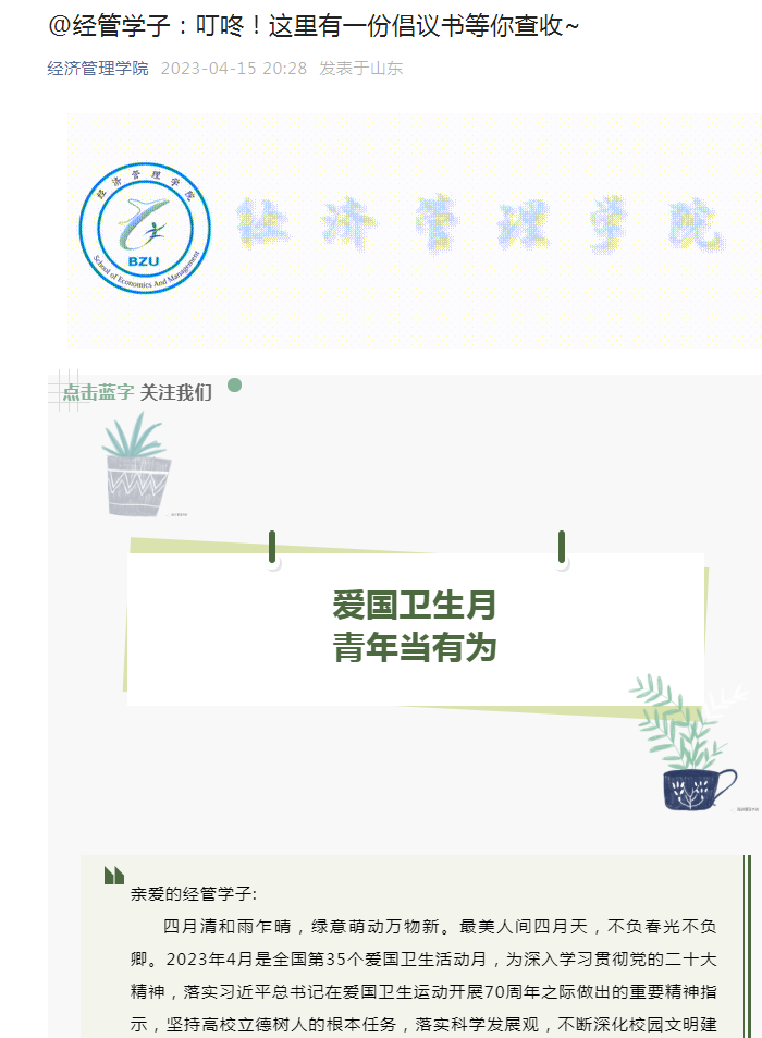 四月清和雨乍晴,绿意萌动万物新。2023年4月是全国第35个爱国卫生活动月,为深入学习贯彻党的二十大精神,落实习近平总书记在爱国卫生运动开展70周年之际做出的重要精神指示,培育和践行社会主义核心价值观,引导大学生养成健康文明的生活习惯,4月16日晚,英国365集团公司召开“文明健康 绿色环保”主题教育班会,我院全体学生参加了此次班会。