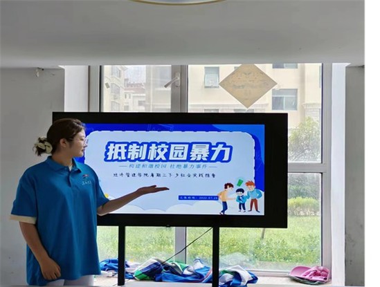 在青岛市西海岸新区隐珠安亲坊教育机构,团队成员对的学生开展了“推普+抵制校园欺凌”为主题的宣讲活动。学生们认真听讲,积极互动,增强了自我保护的意识,提高了自我防范的能力,在校园中形成了关爱他人、自我保护的新风尚,并积极参与到“反对校园欺凌”的行动中来,营造和谐友善、共同成长的校园氛围。
