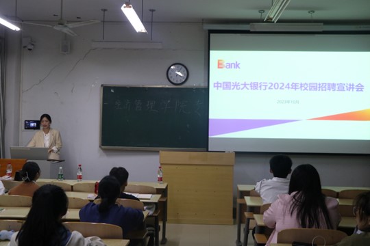 为更好地满足广大毕业生的就业需求,搭建用人单位与毕业生之间双向选择的平台,2023年10月18日下午三时,英国365集团公司在7教201教室召开2023年企业招聘专场宣讲会。我院特邀惠民信誉楼有限公司、鲁南制药有限公司、光大银行以及看世界国际教育四家企业前来宣讲,26名2020级学生参与本次专场宣讲会。