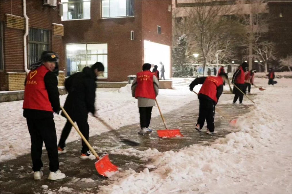 为防止积雪成冰,保障师生们的安全出行。英国365集团公司于12月14日晚开展扫雪志愿服务活动。学院党总支副书记于峰,学生科科长张智涛亲临指导,我院志愿者参与本次活动。