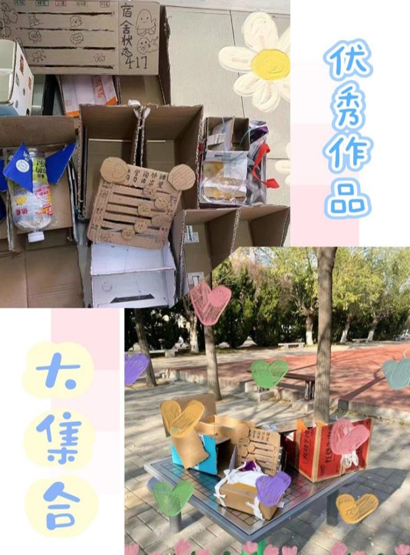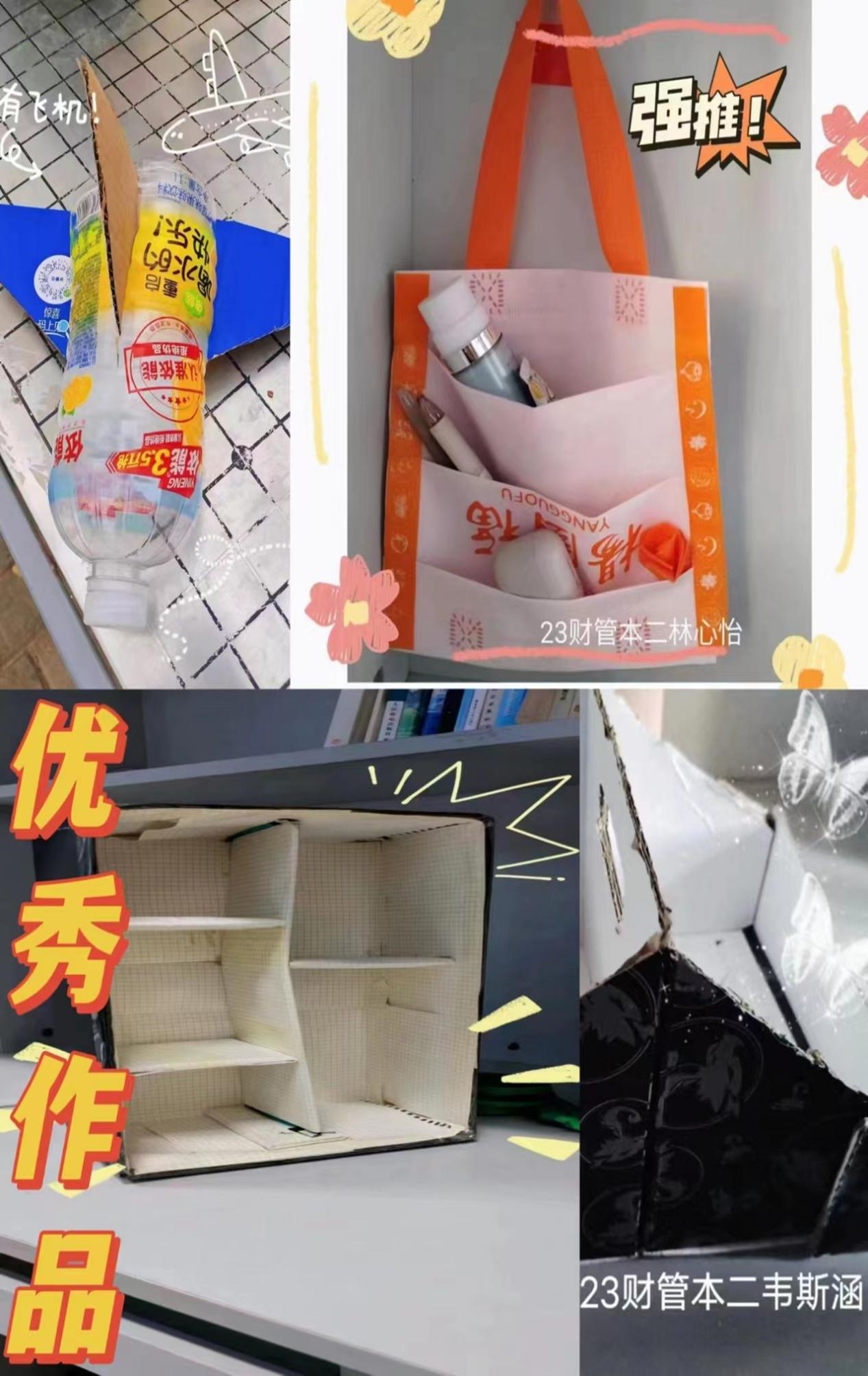 在活动中,各宿舍成员本着“变废为宝、循环利用”的原则,充分发挥自己的聪明才智,利用废旧的塑料、纸箱、树叶等制作作品,将作品设计的富有美感、风格鲜明,将各种废弃物变成了实用而美观的宿舍用品,展现了他们的创造力和环保意识。同学们各展所长,参赛作品可谓是“百花齐放”:有的将塑料瓶与硬纸壳巧妙结合,一架“独一无二”的飞机摆件便出现眼前;有的将外卖袋细致裁剪,制成可以放杂物的“麻辣烫”牌悬挂袋;有的在硬纸板上写写画画,一个灵动可爱宿舍状态表就应运而生了。通过同学们的双手,废物焕发出了新的生命,这让我们深刻地认识到,资源的价值并不在于其原始形态,而在于我们如何去发现和利用。