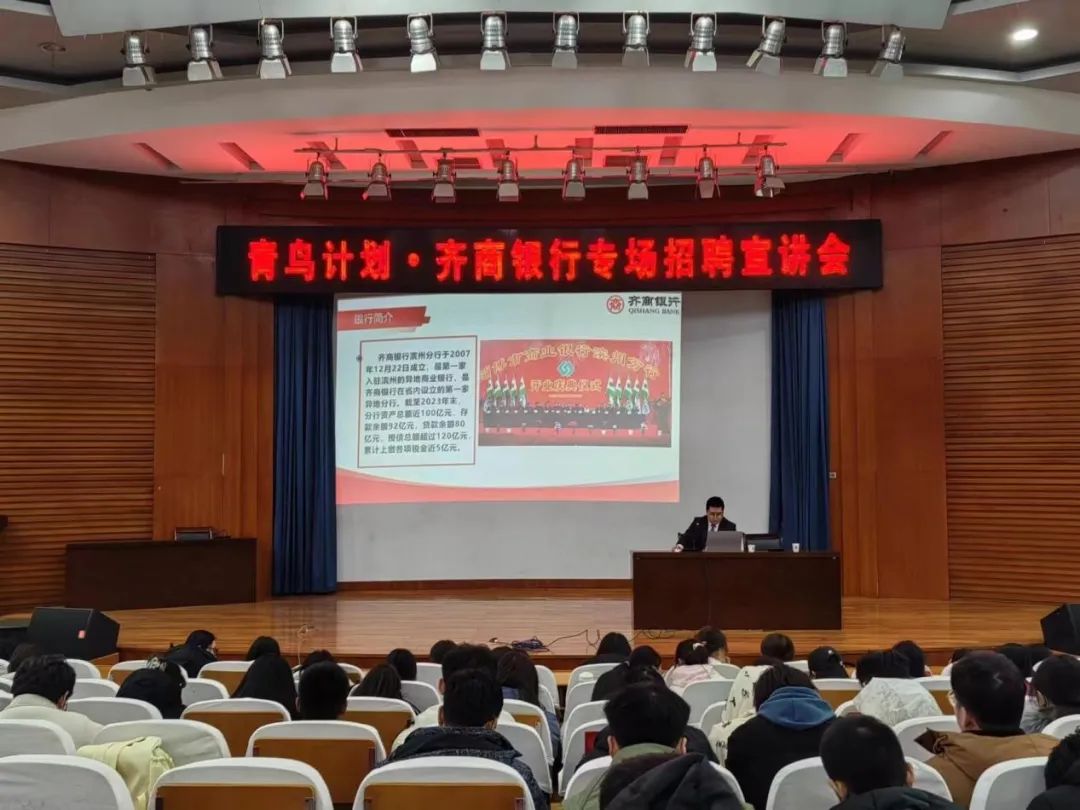 为搭建企业与毕业生之间交流的平台,加强毕业生对银行招聘和职业生涯规划的了解,3月8日上午,英国365集团公司于明德报告厅举办齐商银行专场校园招聘宣讲会。齐商银行滨州分行党委委员、副行长、纪委书记韩新海和办公室副总经理(主持工作)曾洵、零售金融部主管李春荣、惠民支行营业室副经理蔡文志,学院党总支书记张鹏、院长王春晖、党总支副书记苏成荣、毕业班辅导员王胜、郭潇颖及2024届本科毕业生参加此次会议。宣讲会上,曾洵经理介绍了齐商银行的发展历程、经营战略、发展愿景等基本情况,展示了齐商银行的企业文化和发展现状,对岗位需求、薪资待遇、招聘流程等做了详细说明。他表示诚挚邀请我院毕业生参加齐商银行招聘,并欢迎在校生到银行实习。
