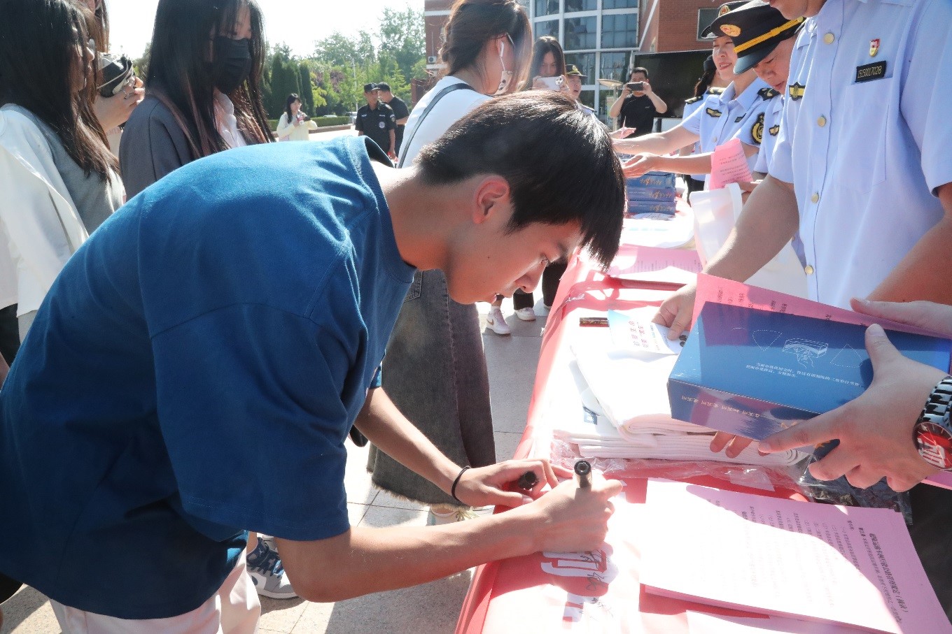 活动现场,执法工作人员通过悬挂宣传横幅、设置普法宣传台、摆放海报展板、发放交通安全宣传资料、播放《拒绝非法营运,莫让“黑车”当道》警示教育片和《路政宣传月系列小视频》等形式,现场为同学们普及交通安全知识和乘坐“黑车”的严重危害,并耐心地就相关法律法规知识与同学们进行面对面交流,引导大家进一步提高安全出行意识,共同维护良好的交通环境。活动最后,在执法工作人员的倡导下,同学们有序地在“公路人人护,路畅心舒畅”的交通安全宣传横幅上郑重地签下了自己的姓名,表明了对交通安全的美好期待和文明出行的决心。