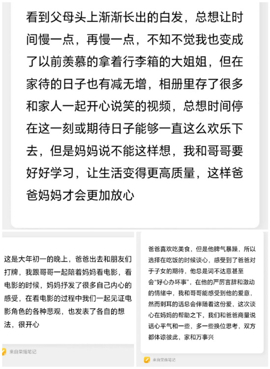 活动线上发起线下践行,感恩之花遍地开。2024级张同学精心烹饪“三菜一汤”团圆饭,让常年在外务工的父母感受到家的温暖;2024级金同学每日记录“亲情对话本”,通过与父母深度交流解开了两代人的心结;更有学生自发组建“家庭服务小分队”,包揽大扫除、年货置办等事务,用劳动分担父母辛劳。活动期间,同学们通过文字、图片或视频等形式记录,并分享了自己的感恩行动和感悟,一字一句饱含着对父母的深情,一帧一幕记录着成长的足迹。