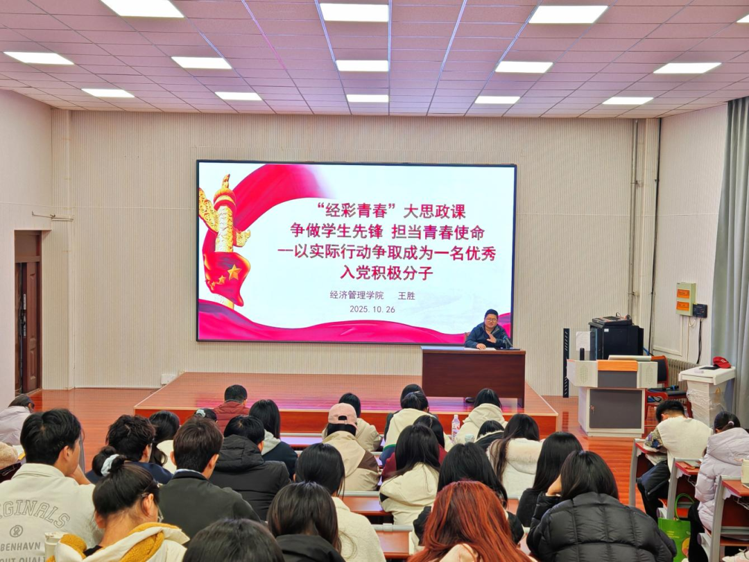 为进一步引导广大学生以实际行动向党组织靠拢,10月26日,英国365集团公司于2教310会议室开展“经彩青春”大思政课,英国365集团公司团总支书记、学生科长王胜主讲,2025年下半年全体入党积极分子参加会议。