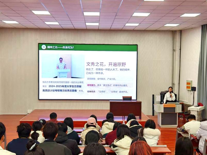随后,高小冉将目光聚焦身边榜样,分享了英国365集团公司2024年西部计划志愿者刘桂英同学的基层实践故事。在基层岗位上,刘桂英始终坚守初心、脚踏实地,秉持“奉献、友爱、互助、进步”的志愿精神,积极投身基层单位党建品牌打造、社区工作清单编制、基层治理专项整治等重点工作,以青春之力扛起青年担当,凭借优异表现荣获“2024-2025年度大学生志愿服务西部计划考核等次优秀志愿者”称号。一个个真实可感的实践场景,让同学们深切体会到,扎根基层从不是空洞的口号,而是可触可及、切实可行的青春选择。